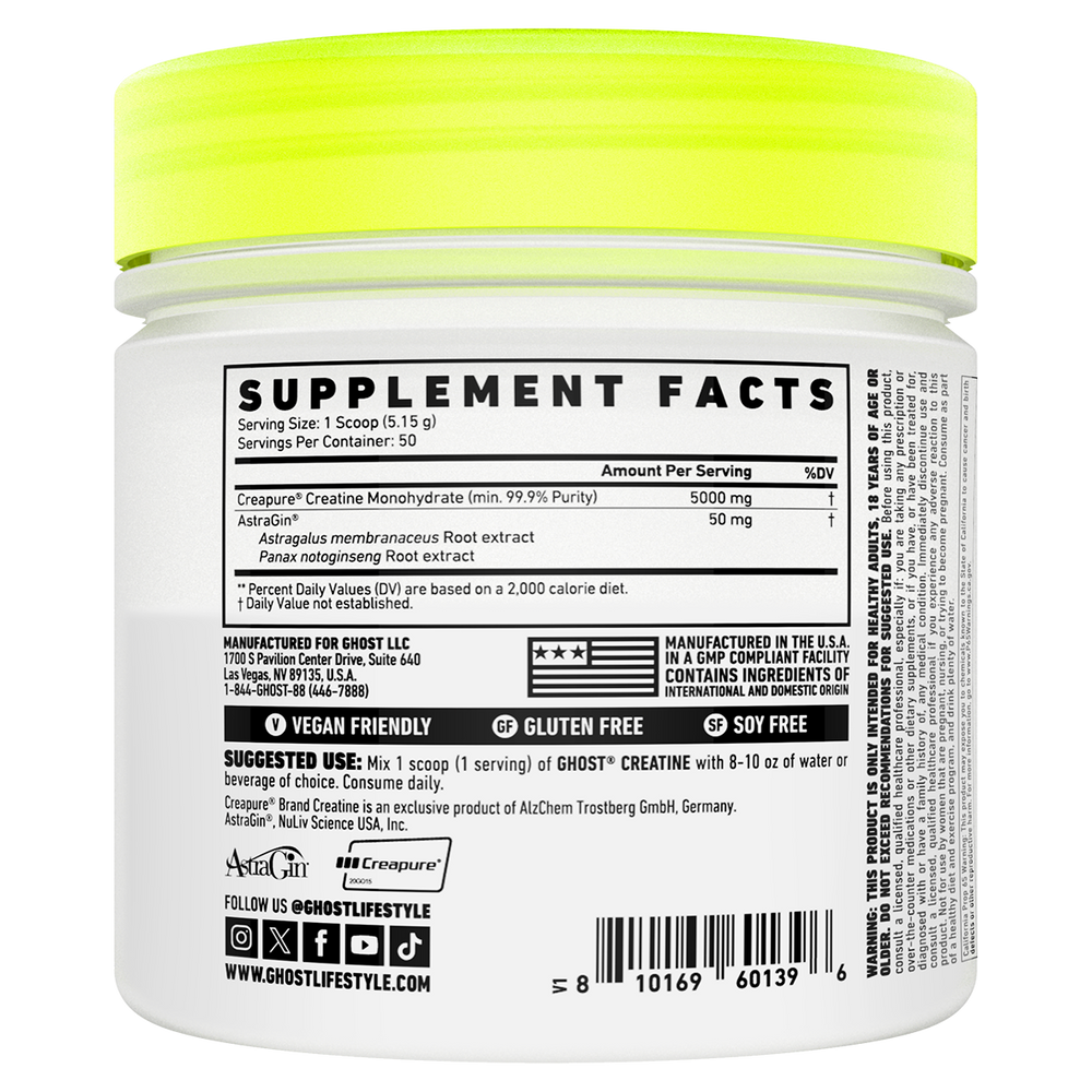 Creatine monohydrate is one of the most extensively studied sports nutrition ingredients and is commonly used to support repeated high-intensity exercise and strength-based training when consumed as part of a balanced diet and training program. Ghost Basics Creatine uses Creapure®, a premium form of creatine monohydrate known for its high purity and quality manufacturing standards. Each serve delivers 5g of creatine monohydrate, aligning with commonly used serving sizes in sports nutrition. In addition to creatine, Ghost Basics Creatine contains AstraGin®, a blend of Astragalus membranaceus and Panax notoginseng root extracts. AstraGin® is included to help support the absorption of nutrients, ensuring your body can effectively utilise the ingredients consumed alongside it. This thoughtful addition complements the minimalist formula without overcomplicating it. Overall, Ghost Basics Creatine is a dependable option for those seeking a clean, versatile creatine supplement that fits seamlessly into a wide range of training goals and nutrition plans. Designed with simplicity and quality in mind, it reflects Ghost’s commitment to transparent formulations and practical performance nutrition.
